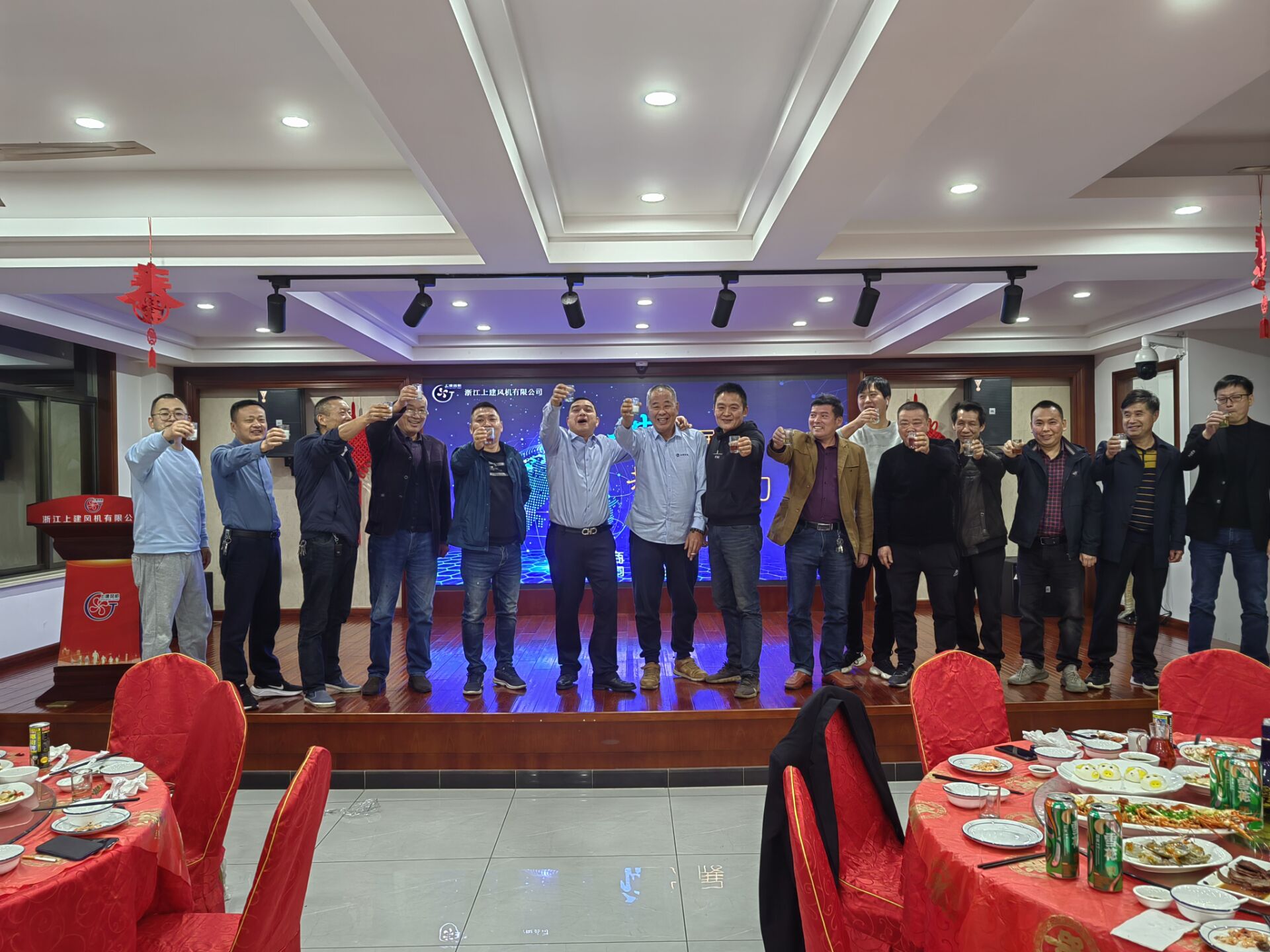 會議結束以后,公司誠邀各位供應商代表會餐。在酒會上主持人貝建波表示公司取的成績得益于市場母體的滋養,凝聚了上建風機全體員工的汗水和智慧,更離不開商業伙伴們的大力支持。并說道“同商,同道,同樂;有你們的支持,我們更有信心;有你們同行,我們更有力量;有我們同在,大家幸福快樂!”